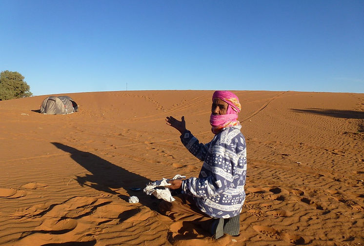 Wir sind nicht die einzigen, die dieses „täglich“ Naturspektakel (Sonnenaufgang im Erg) zu Fuss bestaunen. Ein Mann, sieht aus wie ein Einheimischer mit Fototasche läuft uns entgegen. Cool, denken wir noch, dass sich sogar die Einheimische die Zeit nehmen um sich den Sonnenaufgang anzuschauen. Echt super, ich freue mich irgendwie darüber… doch weit gefehlt. Nach ein paar freundlichen Worten in Englisch-Deutsch-mix möchte er uns was zeigen.