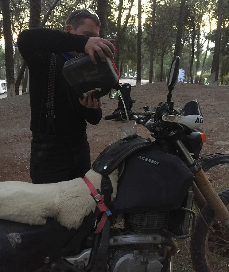 Zurück unter den Pinien modeln wir unser Gepäck noch ein bisschen um, so dass wir morgen, wenn wir auf der Fähre eintreffen alles Griffbereit haben. Der Laderaum wird während der Fahrt verschlossen und was nicht mit in die Kabine kommt, bleibt im Laderaum. 2 Tage später, voraussichtlich um 03:00 Uhr morgens soll unsere Fähre in Italien anlegen. Ab da warten 800 Kilometer Autobahn. Besser jetzt noch einen Check am Motorrad durchführen. Die Kette nachspannen und den Ölstand prüfen. Über 100ml Motorenöl freut sich die kleine Beta.