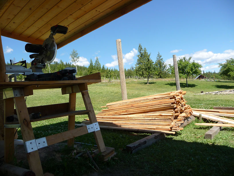 Da ich das Zederholz bereits nach Länge vorsortierte, war es für mich nun ein Kinderspiel. Ich mass die benötigte Länge, nahm das passende Holz vom Stapel, sägte es an der Kreissäge auf das genaue Mass und reichte es George, welcher die Latte ans Grundgestell nagelte. So lief das Hand in Hand. Die Arbeit machte RIESIG SPASS. Wir kamen super vorwärts, ohne dass ich es als stressig oder anstrengend wahrnahm. Es lief einfach Hand in Hand.